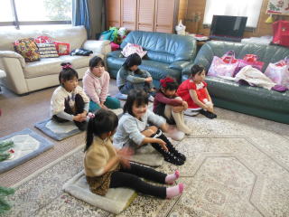 まずは、もりちゃん先生の「今日は楽しくクリスマス会やりましょう!」とのお話 ![]() みんな静かに聞いてたね。 |