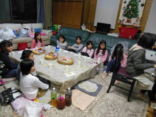 | 二部(小4学年以上) 4時15分~5時45分 今年のクリスマス会は全員参加で欠席者なし!!!かな?と思っていたら・・・一人用事が出来て来られなくなってしまった~~~~との連絡に残念。 気を取り直して、さあ、皆さんお菓子を持ってやってきた。 色々なお菓子が並べられる。その中でSちゃんが手作りのクッキーを焼いて持ってきてくれた☆彡 ツリーとスターが袋に入っていて、封もされて、乾燥剤も入っていて、切り口まで付いている、本格的です! Sちゃんの家、クッキーショップ開けますね・・・凄い~~~!皆で・・・感動でした。 ありがとうございました。勿体ないくて・・・geko先生食べられません(笑) 早速「乾杯!」でクリスマス会スタート☆ |