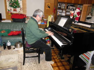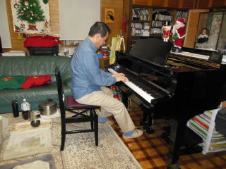 やはり、毎年トップバッターはUさん! 「きよしこの夜」 クリスマス会に相応しい曲ですね 次は、まいちゃんの「イパネマの娘」 今日は後2曲「マシュケナダ」「酒とバラの日々」も 弾いてくれる。3曲弾くの張り切ってま〜す! 次は、セキさんの「見上げてごらん夜の星を」 久しぶりに聴く演奏、情感たっぷり〜素敵な音よ これで喋らなければね〜〜〜(笑) 次は、さとちゃんの「千年恋歌」 ステージアを買って、嬉しい!!! と乗りに乗っている、さとちゃん、バッチリだよ 次は、Tさんの「メドレー」 今まで先生に習った曲を全部入れてのメドレー 何十曲入っているのか数えるの忘れた(笑) 10分以上の演奏に皆さん・・感動!すご〜〜い! 次は、Nさんの「フラミンゴワルツ」 お忙しい中、今日も駆けつけてくれたのね 緊張しながらの演奏・・可愛い 次は、カレンちゃんの歌「ラストクリスマス」 アカペラで、私達が鈴とタンバリンで盛り上げた! 「最近歌ってないわ〜」と言いながらも 「昨日カラオケで2時間歌ったの!」と 素敵な声で歌ってくれたね♪ |