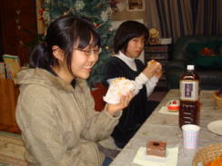| 4時半に2部はスタート♪ この部では、生徒さん達がお菓子を一品持って来て、 お菓子やケーキ、マックを食べながらクリスマス会を行う。 みんなが持ってきたクッキー、チョコなど、甘いお菓子がいっぱい並んだわ(ウフ・・) 今回は4人で・・・ちょっと寂しいけど楽しくやろうね♪ 地元の中学生は2人、後はさいたま市や久喜の学校と様々だったので、 まずは、自己紹介から始まり、 部活の事や、趣味の事など色々とお互いに話した。 最初はぎこちなかったけれど、笑顔が覗き始め だんだんと打ち解けていったね。 でも、まずは弾かないと落ち着かないので、演奏スタート♪ |