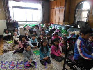 そして「ビンゴ」が始まった。 今年の景品は結構geko先生頑張って用意したので・・ みなさん、満足そうなお顔ふぅ. ε=(。・o・。) ふー ビンゴが終わって・・・ ちょっと時間が余ったので、なぞなぞタイム! これは昨日買っておいたのよgeko先生用意万端! 「楽器じゃないけれど、ひくと音が出るものな~~んだ?」 ![]() うう~~~うん、わからないな??? 「風邪を引くと出るのは??「咳」でした なんて、このなぞなぞ結構むずかしいのでした。 今年は男子が3人もいたから、賑やかな雰囲気の中終わった。 若干1名は静かでしたが・・あの二名が???? 誰~~だ??? って分かりますよね(笑) さあ、来年の発表会は。。。。 このメンバーが全員スタッフだね。 宜しくお願いしま~~す。 と言う事で、「クレッシェンド締め」でクリスマス会二部終了☆ |