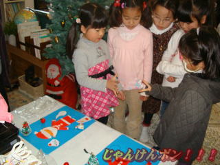 ゲームは「ビンゴ」から始まって・・・ 「文字あてゲーム」 幹事さんが、二人一緒に、一文字ずつ「い」「え」と言って、みんなが「いえ」と言った言葉を当てる。 二人一緒に言うので・・ geko先生や森ちゃん先生は全く分からない〜〜??? でも、生徒さん達は、お耳が良いの、すぐに「ハイ!」と手を挙げる。 見事に正解○ これには、ビックリ!! だんだん人数も増やして、最後は5人で一緒に言う。 「ゆきだるま」「オーケストラ」「サンタクロース」「ソフトクリーム」・・・etc 生徒さん達、またまた見事に正解!! 先生たちは一つもわかりましぇ〜〜んo(TヘTo) くぅ やはり、若さでしょうかヾ(@^▽^@)ノわはは 次に「じゃんけんゲーム」 チームを二つに分けて、じやんけんに勝つと ピースを一つゲットできる。 サンタさんの洋服を着せてプレゼントを持って出来上がり! という仕組み〜。 教室に「最初はグー、じゃんけんポン」 の声が響き渡る。 いや〜〜、みんな元気だったね。 結果は、サンタクロースと、ツリーと二つあったので、引き分けでした。 と和やかな雰囲気で、ゲームも終わり、 最後の歌「赤鼻のトナカイさん」 ハイテンションの生徒さんに引っ張られ(笑)、とってもとっても元気溢れる歌が教室に響き渡った。 そしてgeko先生の挨拶 「今年は、これからクリスマス、そしてお正月・・・」と言った途端 大きな声で「発表会もあるよ!!」と5歳の可愛い生徒さんが言った。 geko先生もビックリ!! 小さいのにもう来年の発表会を自覚している、凄〜〜い!! すかさず・・ 「そうね、来年は発表会があるから、一生懸命に練習頑張ってね♪」と言うと・・ 全員「は〜〜い!!」 みなさ〜〜ん、この言葉を忘れず・・・先生と一緒に頑張ろうね♪ そして 最後に幹事さんが「これでクリスマス会を終わりにします」で終了! 今年も笑顔いっぱいの楽しいクリスマス会だったね。 幹事さんご苦労様でした。" ゚☆,。・:*:・゚★o(´▽`*)/♪Thanks♪\(*´▽`)o゚★,。・:*:・☆゚" |